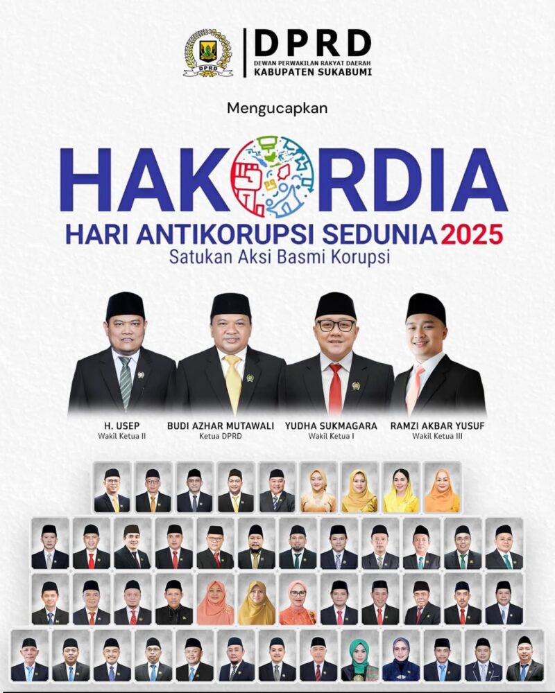 Dengan mengusung tema “Satukan Aksi Basmi Korupsi”, DPRD Kabupaten Sukabumi mengajak seluruh elemen masyarakat untuk bergerak bersama dalam memberantas praktik korupsi serta memperkuat kepercayaan publik terhadap pemerintah.